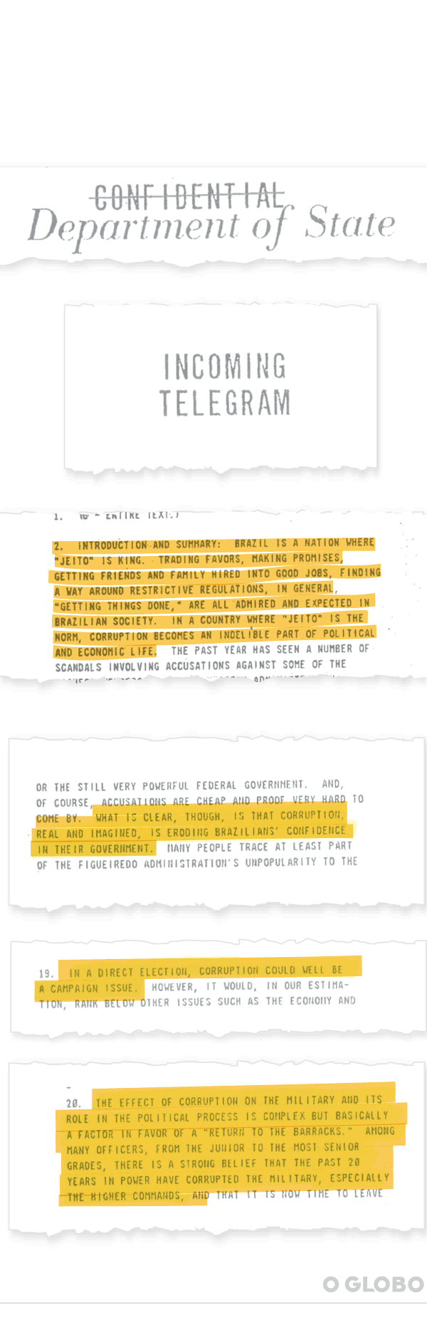 Numa introdução didática para burocratas de Washington, o telegrama explica o que é o “jeitinho”, um fenômeno social brasileiro, seu papel na prática cotidiana e como, devido a isso, a corrupção seria parte indissociável da política e da economia no país. A partir daí, o texto traça um quadro da decadência do governo Figueiredo, ao mencionar uma série de acusações de corrupção. “No nível nacional existem muitos escândalos que lançam nuvens sobre o governo Figueiredo”, diz o informe.