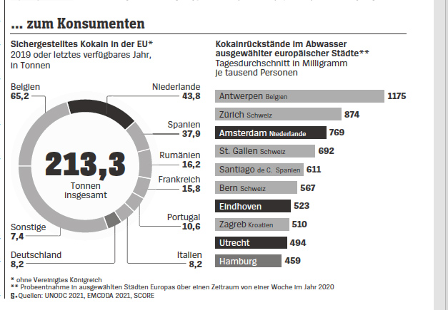 Mas a história de Der Spiegel, na qual a formação não é mencionada, parece um longo conto moral em que a Alemanha é instada a não escolher o caminho dos Países Baixos. Em 2019, a polícia alemã investigou 161 casos de drogas na Holanda, muito mais do que em outros países. "A Holanda é o supermercado de drogas da Europa", disse Frank Buckenhofer, chefe da polícia alfandegária. “Os profissionais de importação, cultivo, produção e distribuição de drogas estão na Holanda.” As drogas holandesas são tão boas e baratas quanto o queijo Frau Antje, diz Der Spiegel.
