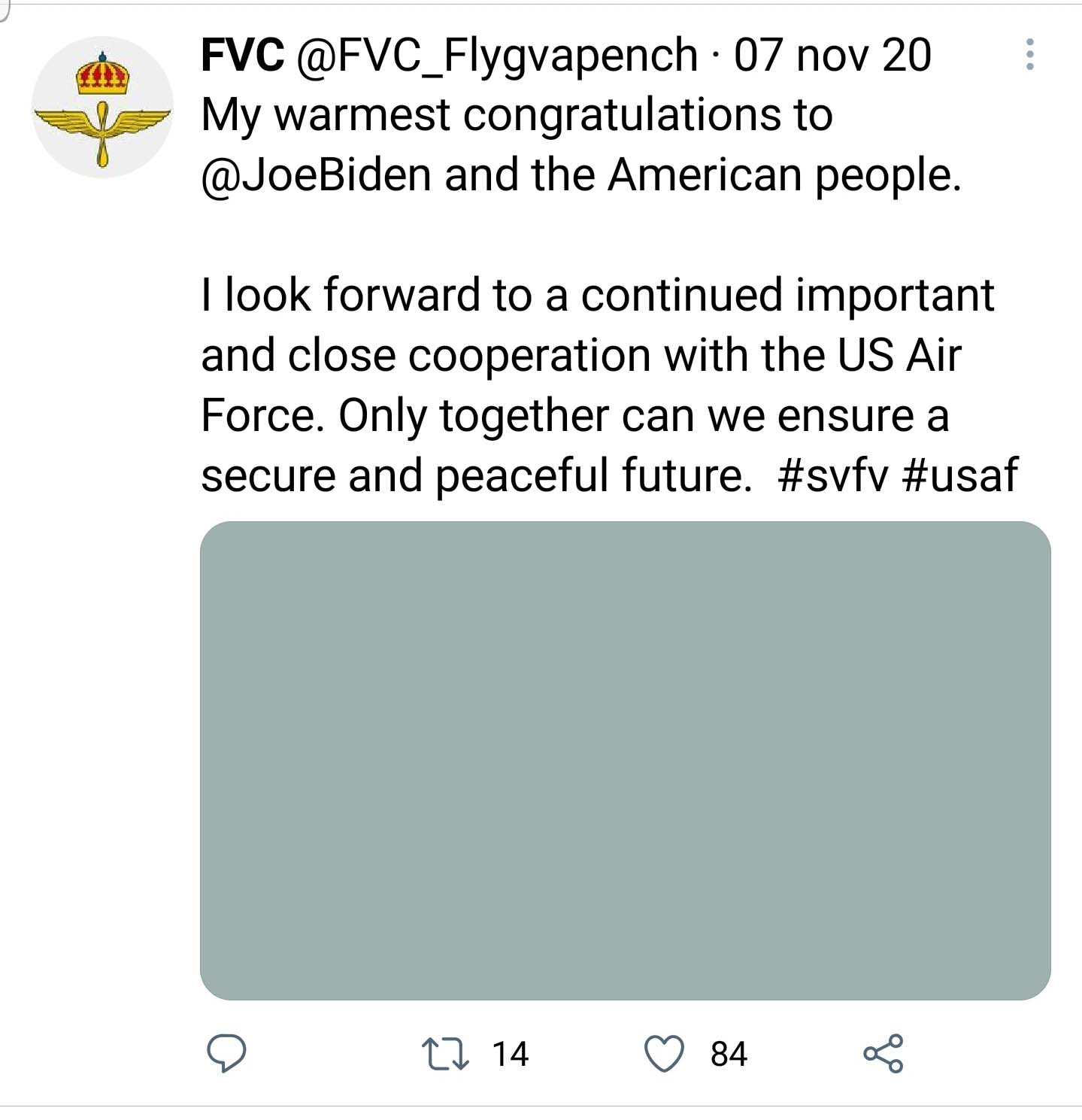 Para termos a ideia do alinhamento das Forças Armadas suecas, em especial a Flyvapnet, temos acima o twitter postado quando da eleição de Joe Biden pelo General Carl-Johan Edström, comandante da Força Aérea