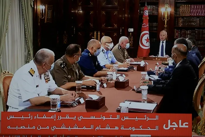 Junto com seu staff Militar o Chefe de Estado Tunisiano, Kais Saied, anuncia a suspensão dos trabalhos do Parlamento. Foto da captura da transmissão via televisão.