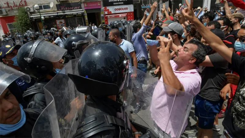 7. 25 de Julho é uma data especial na Tunísia – Proclamação da República. Pelo simbolismo do dia, a população decidiu protestar contra o Ennahda em várias regiões do país, tendo a sede do partido sido depredada ou incendiada em diversas municipalidades. Foram registrados, ademais, tumultos e confrontos mais contundentes com as forças de segurança. Além da situação ter se deteriorado rapidamente, some-se o fato de que, na percepção popular, o Ennahda e o Primeiro-Ministro Mechichi são os responsáveis imediatos pela duradoura crise econômica do país e pela inabilidade no gerenciamento da crise sanitária decorrente do Covid-19 – o país registra um número desproporcional e alarmante nos óbitos e contaminações, ainda que tenha sido iniciado um processo de vacinação em massa há meses.