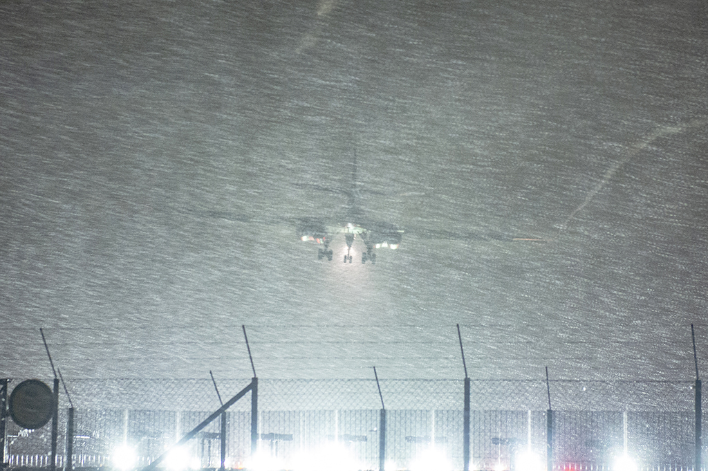 B-1B Lancer da 9th Expeditionary Bomb Squadron (EBS), na fase final de pouso, em difícil condição de visibilidade devido a forte nevasca, na Base de Ørland da Força Aérea da Noruega 08MAR2021. A Operação na Noruega da 9ª EBS é para demonstrar a capacidade de adaptar-se às condições locais em missões estratégicas globais – Foto – U.S. Air Force