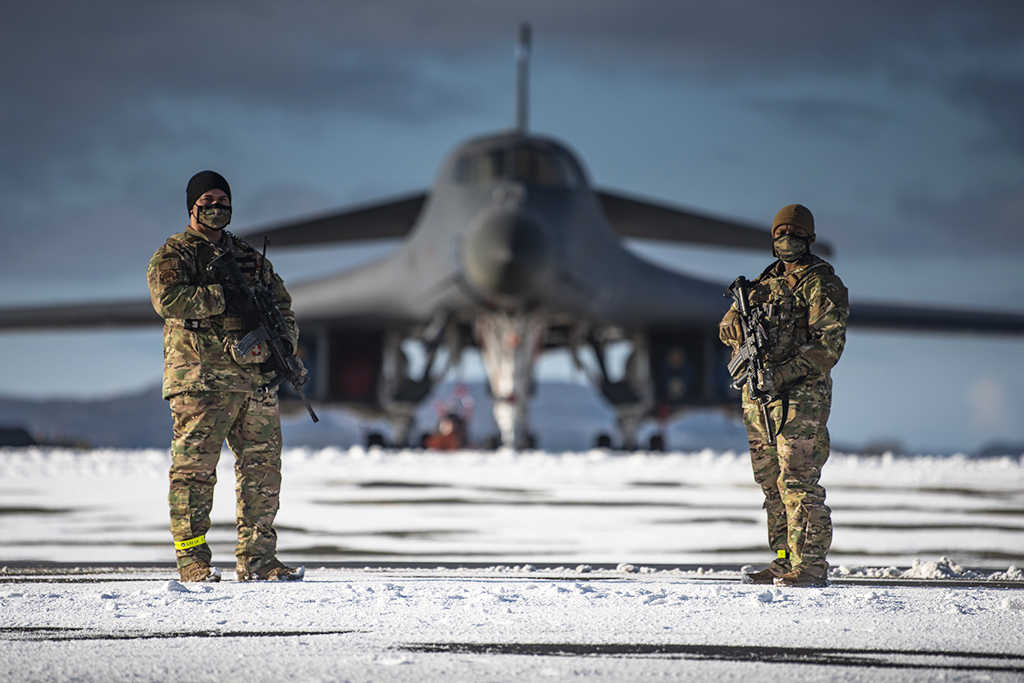 Dois membros da 7ª Security Forces Squadron realizam defesa de perímetro de um B-1B Lancer na Base Aérea de Ørland Air Force Station, Noruega, 07MAr2021. Oito das Forças de Segurança integraram a 9ª Expeditionary Bomb Squadron em apoio a Bomber Task Force Europe para prover a Internal Security Response Team. Foto U.S. Air Force