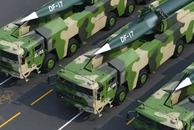 A China apresentou em 2019 o míssil hipersônico DF-17, que tem alcance médio, de aproximadamente 2.000 quilômetros, e pode transportar ogivas nucleares.