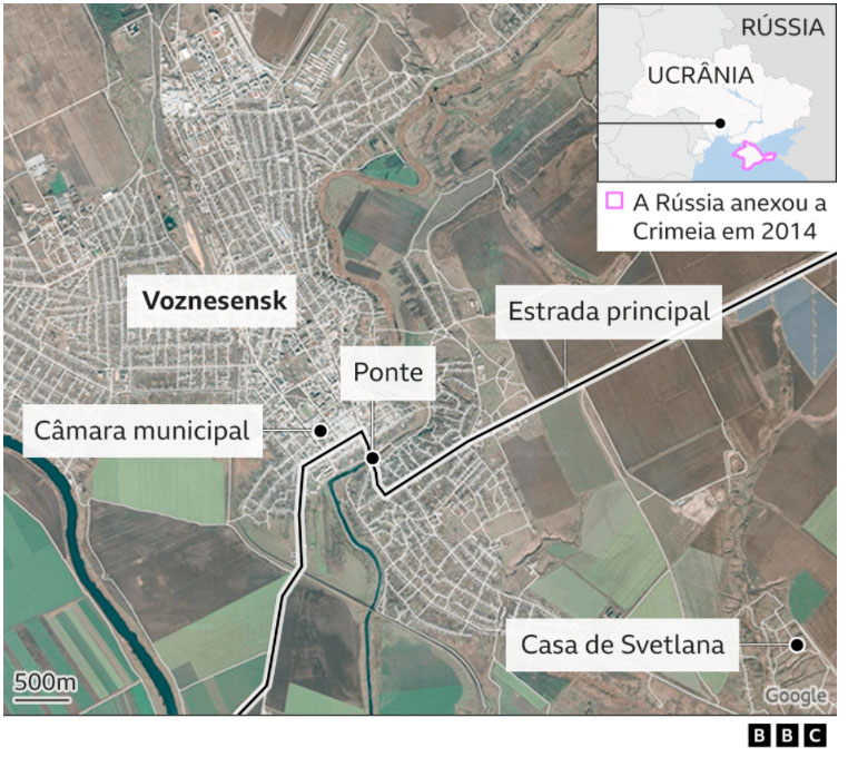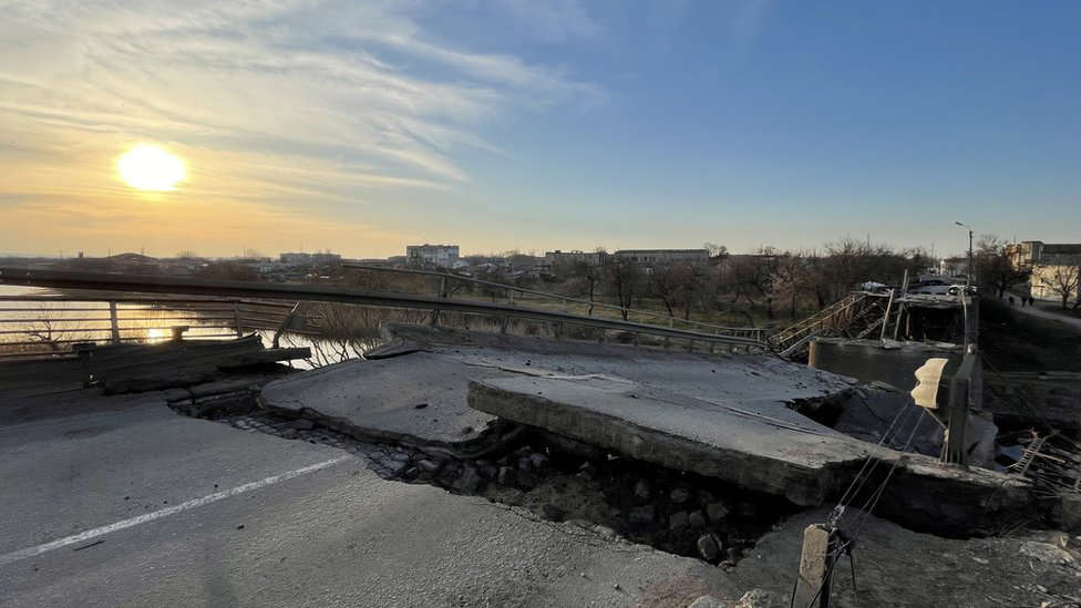 | © Fornecido por BBC News A ponte estrategicamente importante de Voznesenk foi explodida para impedir que os russos a usassem. |