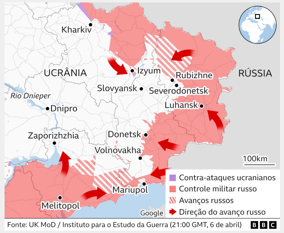 As forças russas estão tentando cercar o exército ucraniano no leste do país, movendo-se a partir do norte, leste e do sul. "É um grande território a ser controlado e acho que não devemos subestimar as complexidades geográficas da região", afirma Tracey German, professora de conflitos e segurança do King's College de Londres.