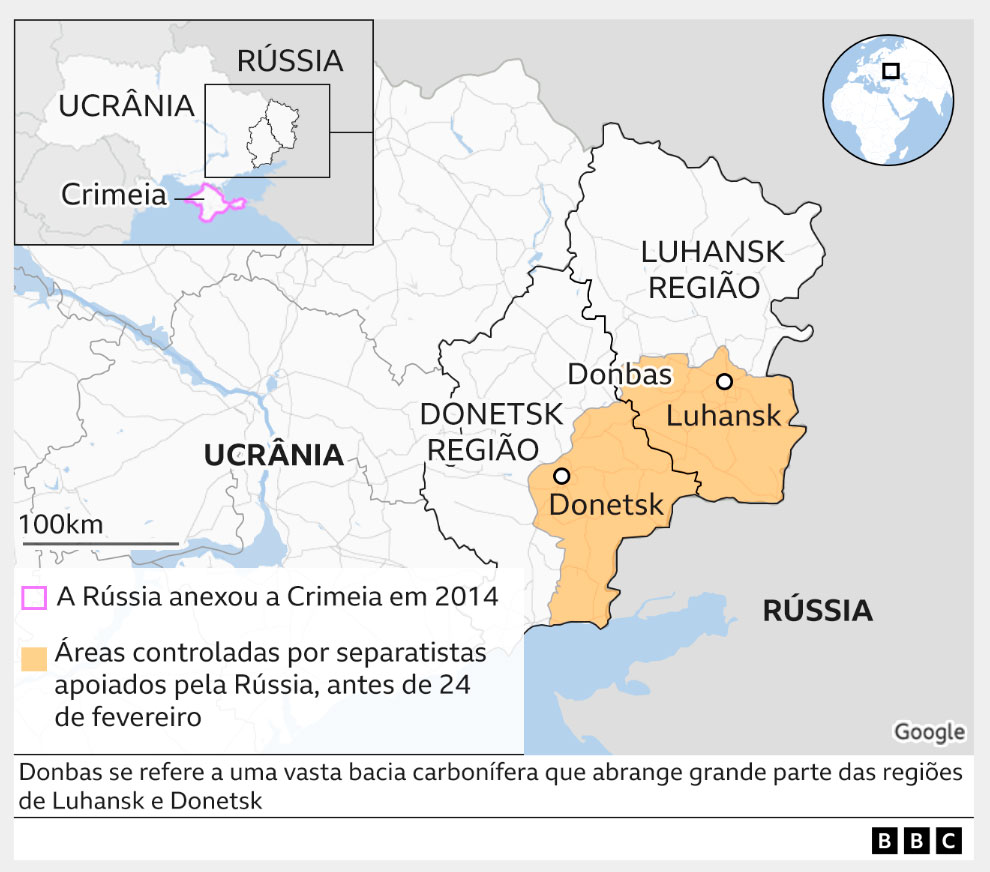 Quando o presidente Putin fala em Donbas, ele se refere à antiga região produtora de carvão e aço da Ucrânia. Ele quer indicar, na verdade, a totalidade de duas grandes regiões orientais, Luhansk e Donetsk, que cobrem desde a área próxima a Mariupol, no sul, até a fronteira com a Rússia no norte.