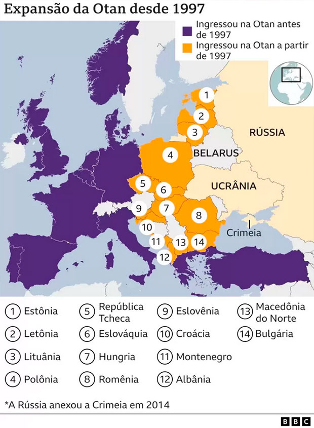 Um dos principais motivos que levaram Vladimir Putin a prosseguir com a invasão da Ucrânia é seu receio em relação à OTAN. Para Moscou, os Estados Unidos e a Europa Ocidental utilizam a aliança para cercar a Rússia, de forma que tem exigido quer que a organização cesse suas atividades militares no Leste Europeu.