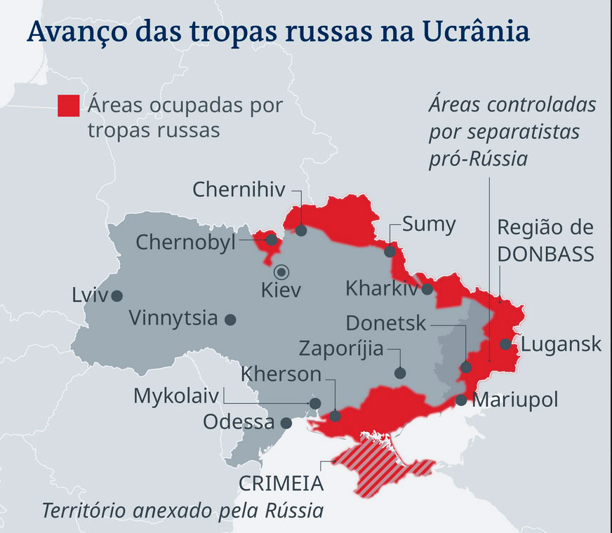 As forças russas na Ucrânia parecem ter mudado de foco, deixando em segundo plano uma possível ofensiva terrestre contra Kiev para, em vez disso, priorizar o que Moscou chama de "libertação" da região separatista de Donbass, parcialmente controlada por forças pró-russas, sugerindo uma nova fase da guerra.