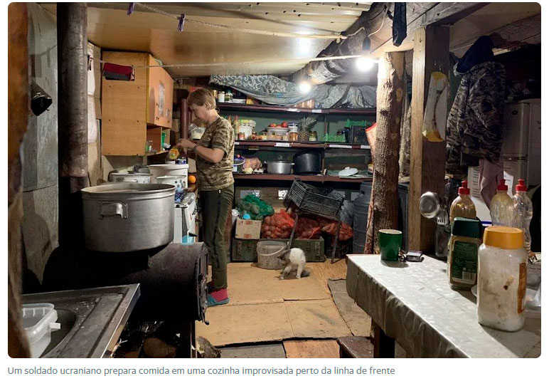 "Foi muito difícil deixá-lo", conta. "Mas desde que eu tinha seis anos meu sonho era entrar para o exército. Eu não achava que acabaria na linha de frente, mas não me arrependo de estar aqui." Perto, um de seus companheiros cortava madeira com um machado. O frio é uma ameaça constante, com os separatistas a cerca de um quilômetro de distância.