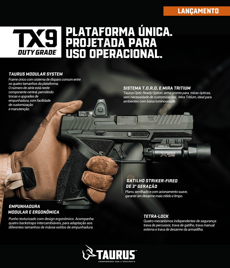 A Taurus Armas lançou no mercado mundial a pistola TX9, plataforma única projetada para uso operacional com quatro tamanhos modulares e intercambiáveis. A arma tem garantia vitalícia e passa a integrar o portfólio Taurus Military Products, divisão de produtos estratégica da fabricante gaúcha.