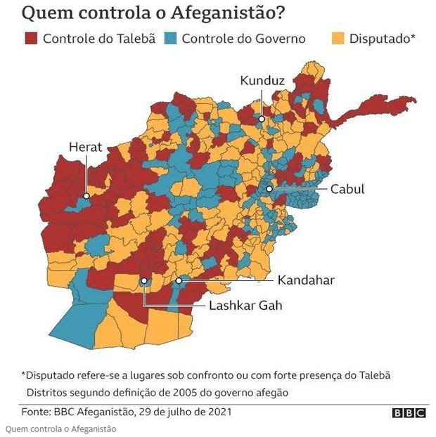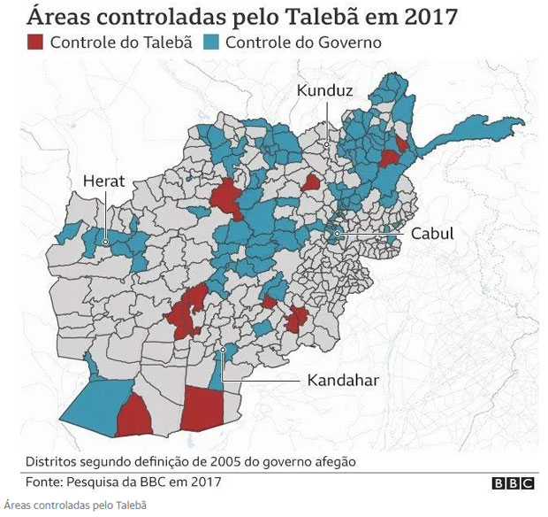 O termo "controle" se refere aos distritos onde o centro administrativo, a sede da polícia e todas as outras instituições governamentais são controladas pelo Talebã. Tropas dos Estados Unidos, de seus aliados na região e da Otan (Organização do Tratado do Atlântico Norte) retiraram o Talebã do poder em novembro de 2001.