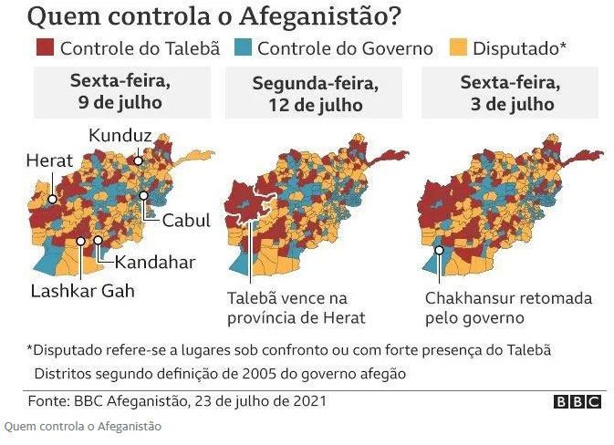 O mapa de controle do Afeganistão tem passado por constantes transformações nos últimos 20 anos. Nas imagens a seguir, observamos as mudanças sobre quem controla quais áreas no país. Nas últimas semanas, o Talebã parece encorajado pela saída progressiva das tropas dos EUA e vem tomando muitos distritos das mãos de forças governamentais.