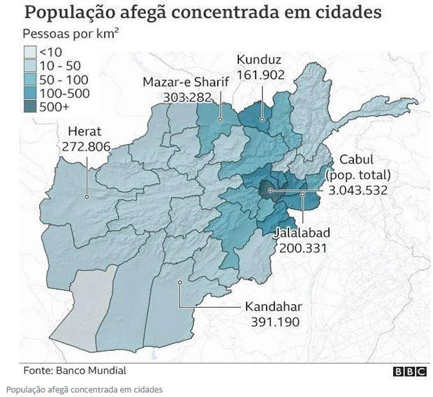 As forças do governo afegão controlam principalmente as cidades e distritos localizados nas planícies ou nos vales dos rios, locais onde também vive a maioria da população.