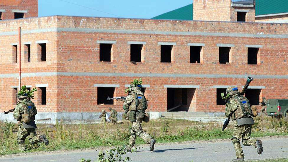 | © Fornecido por BBC News Instrutores militares ucranianos e do Exército dos EUA participam de exercícios no Centro Internacional de Segurança de Manutenção da Paz em 4 de fevereiro de 2022 |