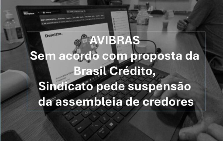 Sindicato dos Metalúrgicos de São José dos Campos e Região13 Maio 2025 A Assembleia Geral de Credores (AGC) da AVIBRAS, ocorrida virtualmente nesta terça-feira (13MAIO2025), foi suspensa a pedido do Sindicato dos Metalúrgicos de São José dos Campos e Região, que encontrou pontos prejudiciais aos trabalhadores na proposta apresentada pela Brasil Crédito Gestão Fundo de … Continue lendo AVIBRAS – Sem acordo com proposta da Brasil Crédito, Sindicato pede suspensão da assembleia de credores