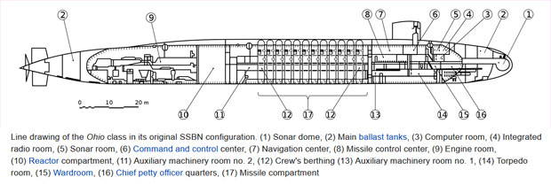 Com capacidade para mais de 150 tripulantes, é um submarino de mísseis balísticos da classe Ohio, uma plataforma de lançamento indetectável. Inicialmente, carregava 24 mísseis balísticos com múltiplas ogivas guiadas de maneira independente. Após os acordos do Novo Tratado de Redução de Armas Estratégicas, porém, quatro de seus tubos de mísseis foram desativados permanentemente. Agora o submarino carrega no máximo 20 mísseis.