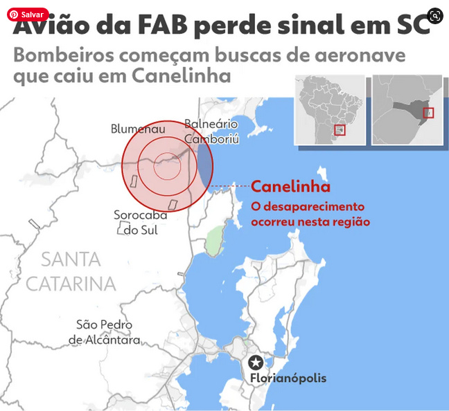 O comando do Corpo de Bombeiros da Grande Florianópolis informou que recebeu um pedido de apoio da FAB para busca de um possível desaparecimento de aeronave. A última localização, segundo a corporação, foi entre os municípios de Canelinha e Tijucas. "Essa aeronave pode ter antecipado um pouso forçado. Até que se encontre efetivamente algum indicio ou algum destroço, ou uma parte da aeronave, a gente não tem como confirmar se ela caiu ou se fez um pouso forçado. Mesmo se fez um pouso forçado, a situação dos pilotos, nada disso [é possível saber]", disse Losso.
