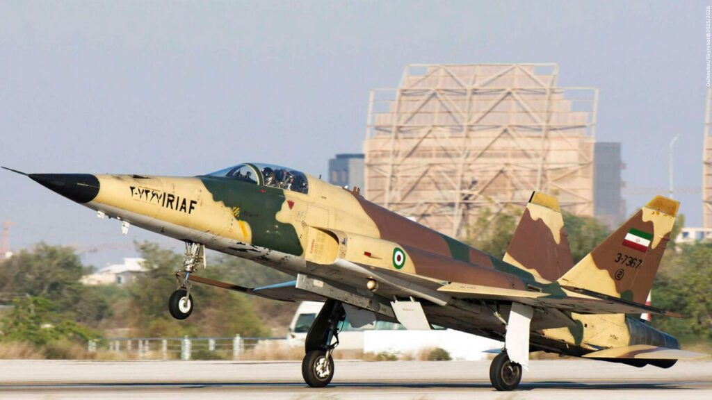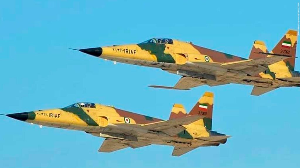 F-5 iraniano: O Irã opera versões do Northrop F-5 Tiger II desde antes da Revolução de 1979. Apesar de ser um caça leve concebido nos anos 1950/60, parte da frota recebeu modernizações locais em aviônicos, radares, armamentos e manutenção estrutural. Também serviu de base para projetos nacionais, como o Saeqeh e o Kowsar. Em 2026, permanece útil sobretudo em missões secundárias, ataque leve, treinamento avançado e emprego assimétrico, embora esteja defasado frente a caças de geração mais recente.