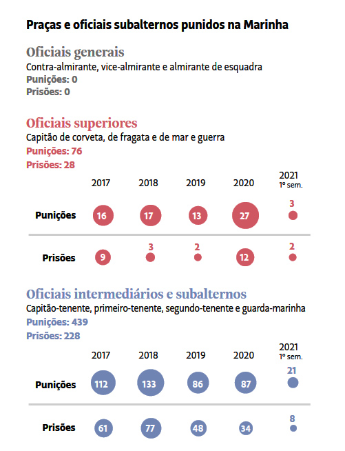 A oficiais intermediários e subalternos, o número foi de 439 em pouco mais de quatro anos, ou uma a cada quatro dias. Entre os oficiais superiores —capitães de corveta, de fragata e de mar e guerra, o equivalente a major, tenente-coronel e coronel no Exército—, houve 76 punições no mesmo período. Isto equivale a uma punição a cada 22 dias, em média.