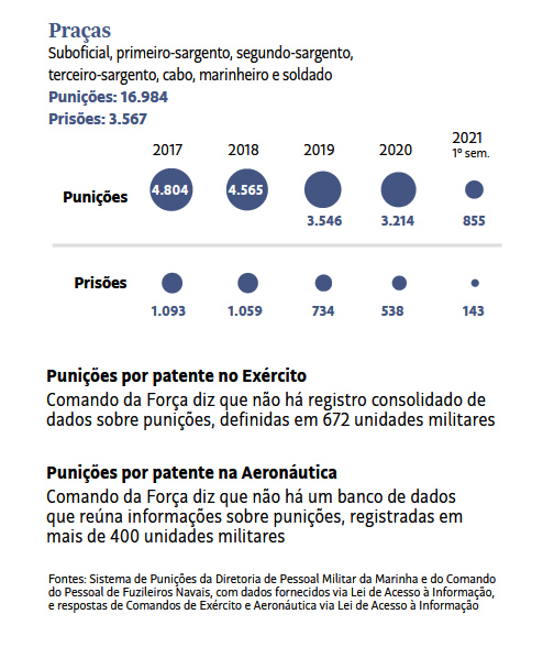 Entre 2017 e o começo de 2021, pouco mais de quatro anos, foram aplicadas 17 mil punições por transgressões de suboficiais, sargentos, cabos, marinheiros e soldados. Isto significa mais de dez punições por dia, em média.