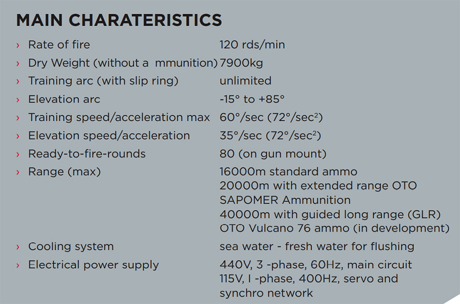 O canhão OTO 76/62 SR (junto ao 76/62 Compact) é único sistema naval capaz de sustentar uma cadência de disparo, o que é um requisito esssencial em qualquer cenário envolvendo o engajamento simultâneo de vários alvos em movimento, como requerido no ambiente de ameaças assimétricas. Carregamento automático é proporcionado inclusive durante os disparos.