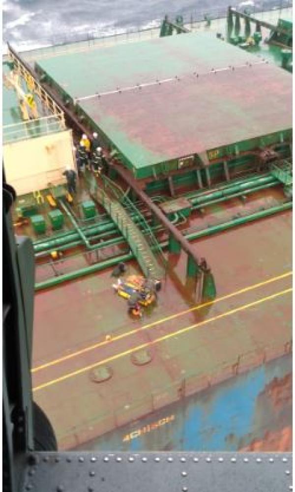 Com dois homens de resgate no convés, foi colocado um colar cervical na vítima, que posteriormente foi transportada na maca. No momento do içamento do marinheiro, ventava bastante e o navio já se encontrava a 130 milhas (240 quilômetros) da costa.