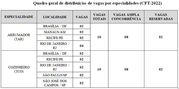 As vagas são destinadas a candidatos de ambos os sexos, que atendam às condições e às normas estabelecidas nas Instruções. Para serem habilitados à matrícula no Curso de Formação de Taifeiros (CFT), o candidato não deve possuir menos de 17 nem completar 25 anos de idade, até 31 de dezembro de 2022 e ter concluído, na data da Concentração Final do certame, o Ensino Médio (para todos os candidatos) e ter concluído, com aproveitamento, o Curso de Qualificação Profissional na especialidade a que concorre, até a Validação Documental e Habilitação à Matrícula.