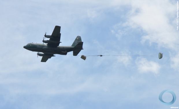 Durante uma manobra realizada pelo Primeiro Grupo de Transporte de Tropa (1º GTT) da V FAE e pela Brigada de Infantaria Paraquedista do Exército Brasileiro, duas cargas pesadas foram lançadas em sequência de uma aeronave C-130 Hércules, na manhã da última quarta-feira (27/02), na área de lançamento da Base Aérea dos Afonsos (BAAF), localizada no Rio de Janeiro.