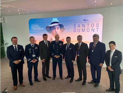 A comitiva do Comando da Aeronáutica (COMAER) visitou o estande da EMBRAER, onde se fez uma homenagem ao Sesquicentenário de Alberto Santos Dumont, Pai da Aviação e Patrono da Aeronáutica Brasileira, que voou no 14-Bis, no Campo de Bagatelle, em Paris, em 1906.