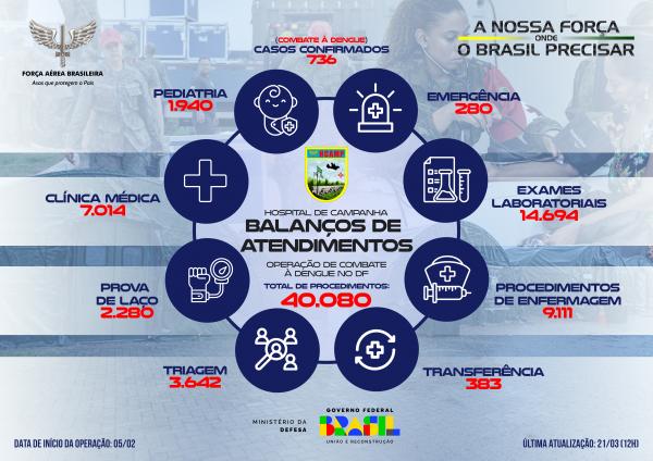 O Hospital de Campanha (HCAMP) da Força Aérea Brasileira (FAB), instalado no Distrito Federal, alcançou a marca de mais de 40 mil procedimentos realizados aos pacientes com suspeita ou diagnosticados com dengue em 45 dias.