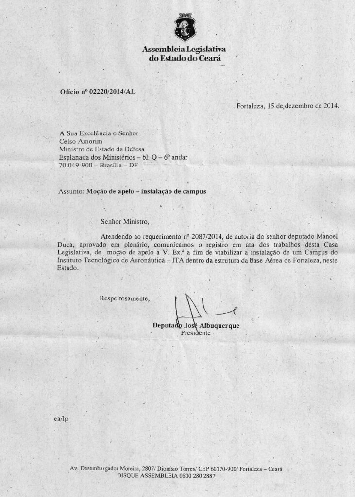 O Plenário da Alece aprovou em duas ocasiões ofício com moção de apelo para a instalação de campus do ITA na Base Aérea de Fortaleza. O documento chegou a ser enviado ao comandante da Aeronáutica, ao ministro da Defesa e ao reitor do ITA da época. Porém, naquele momento não houve resposta favorável ao projeto.
