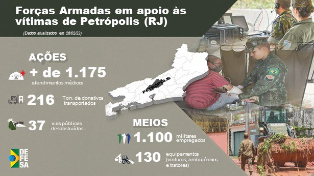Desde 16 de fevereiro, o Ministério da Defesa determinou o emprego temporário e episódico das Forças Armadas em ações de apoio à Defesa Civil na região serrana do Rio de Janeiro. A operação busca atenuar os efeitos das fortes chuvas que atingiram o município de Petrópolis.