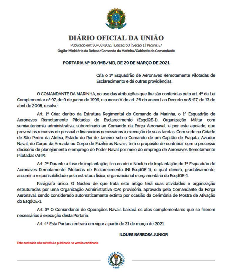 Art. 1º Criar, dentro da Estrutura Regimental do Comando da Marinha, o 1º Esquadrão de Aeronaves Remotamente Pilotadas de Esclarecimento (EsqdQE-1), Organização Militar com semiautonomia administrativa, subordinado ao Comando da Força Aeronaval, e por este apoiado, que proverá os recursos de pessoal e financeiros necessários à execução de suas tarefas. Com sede na Cidade de São Pedro da Aldeia, Estado do Rio de Janeiro, sob o Comando de um Capitão de Fragata, Aviador Naval, do Corpo da Armada ou Corpo de Fuzileiros Navais, terá o propósito de contribuir com o processo decisório de planejamento e emprego do Poder Naval por meio do emprego de Aeronaves Remotamente Pilotadas (ARP).