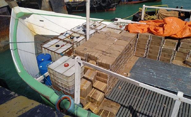 No convés e no porão do barco havia mais de 3.000 pacotes de cigarros contrabandeados |