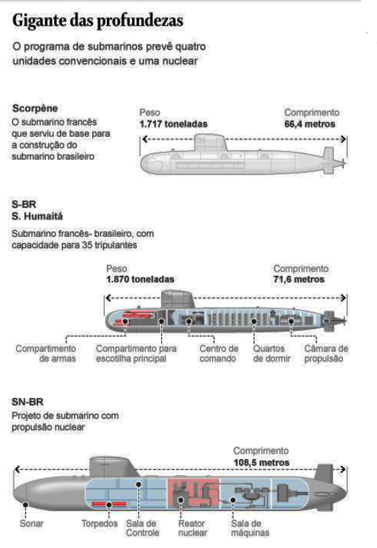 O programa de submarinos, lançado em 2008, no governo Lula, prevê investimento total de R$ 37,1 bilhões, incluindo quatro embarcações de propulsão convencional — com motores diesel-elétricos de fabricação francesa — e uma quinta (e mais aguardada) de propulsão nuclear, com previsão de entrega somente em 2031 e cuja produção é, no mínimo, desafiadora.