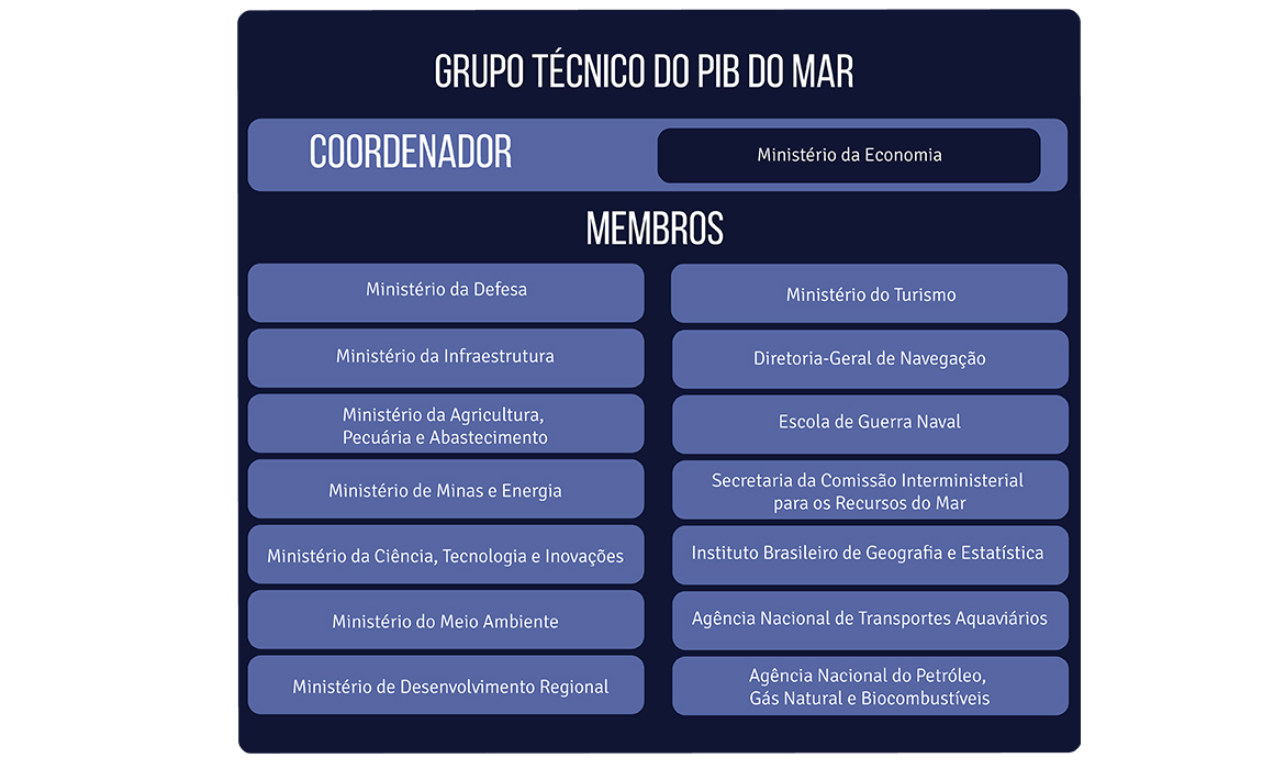 No País inexiste, até o momento, uma metodologia oficialmente reconhecida para o cálculo do “PIB do Mar”, não sendo possível, assim, quantificar, de forma metódica, uniforme, contínua e perene, o valor gerado pelo somatório das atividades ligadas ao mar. Por isso, foi criado em 2020 o Grupo Técnico “PIB do Mar”, no âmbito da Subcomissão para o Plano Setorial para os Recursos do Mar (PSRM) da Comissão Interministerial para os Recursos do Mar e coordenado pelo Ministério da Economia, para definir o conceito “Economia do Mar” para o Brasil, e identificar os setores e atividades que integram e/ou contribuem para a Economia Azul.