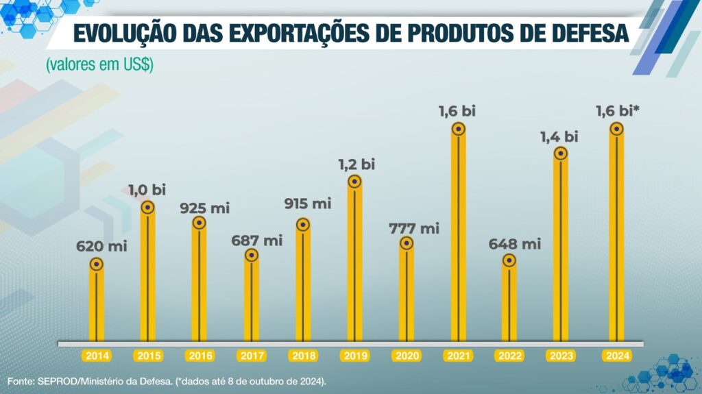 Ainda durante o evento, o Secretário de Produto de Defesa (SEPROD), Tenente-Brigadeiro Heraldo Luiz Rodrigues, informou que, neste mês, as exportações autorizadas de produtos de defesa alcançaram a cifra de US$ 1,6 bilhão (equivalente a R$ 8,8 bilhões na cotação do dia), igualando o patamar histórico da indústria de defesa registrado em 2021. Com as negociações em curso em 2024, o novo recorde de exportações no período de 2014 a 2024 será alcançado este ano. A nova evolução no índice deve-se a fatores como a busca crescente de novas oportunidades comerciais, o potencial competitivo e a capilaridade da BID.