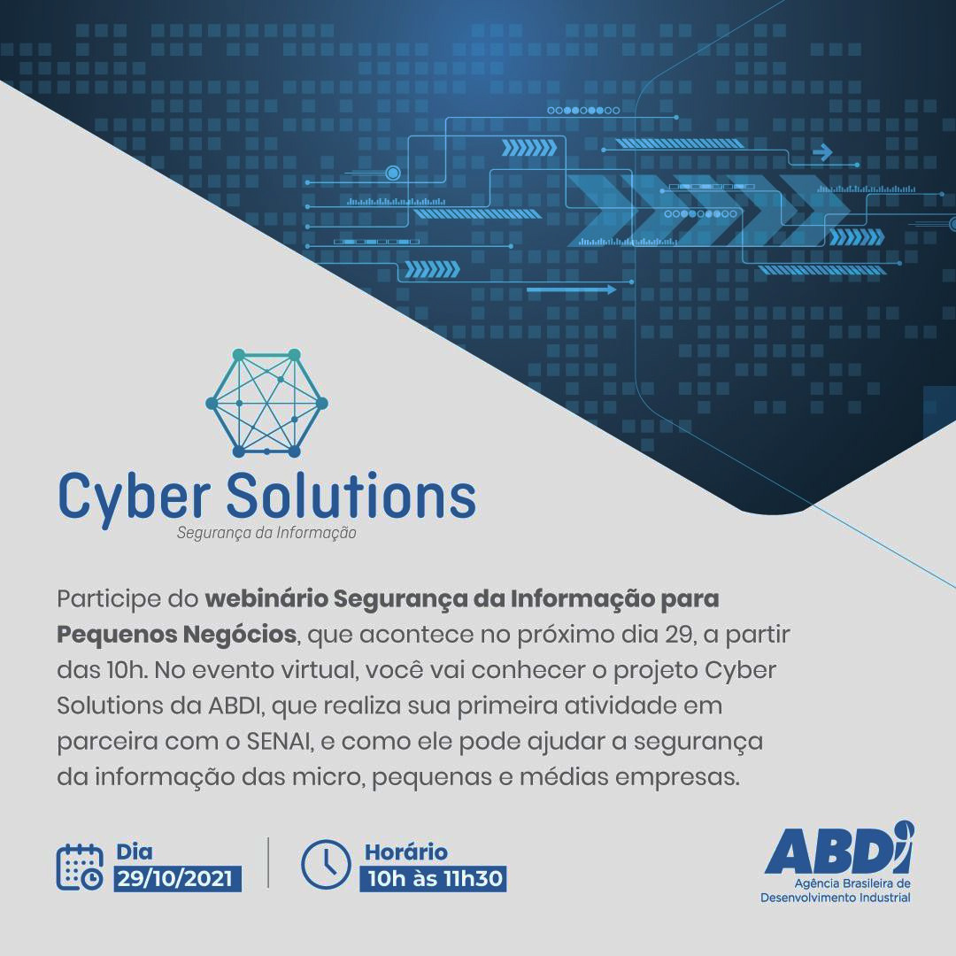 Atenta a esse cenário, a ABDI criou o Projeto Cyber Solutions e vai promover, em parceria com o Serviço Nacional de Aprendizagem Industrial (SENAI), o Webinário Segurança da Informação para Pequenos Negócios.