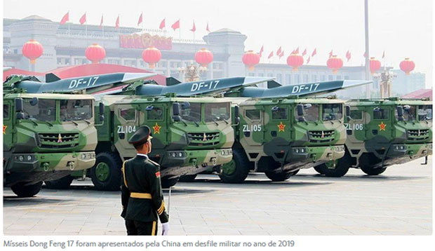 O míssil chinês Dong Feng 17, revelado pela primeira vez em 2019, carrega um veículo planador hipersônico (HGV) que pode fazer manobras pela atmosfera com uma trajetória quase imprevisível, o que dificulta a interceptação.