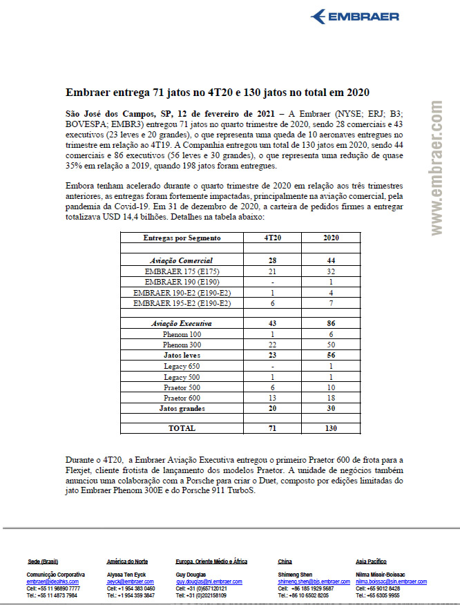 Embora tenham acelerado durante o quarto trimestre de 2020 em relação aos três trimestres anteriores, as entregas foram fortemente impactadas, principalmente na aviação comercial, pela pandemia da Covid-19. Em 31 de dezembro de 2020, a carteira de pedidos firmes a entregar totalizava USD 14,4 bilhões.