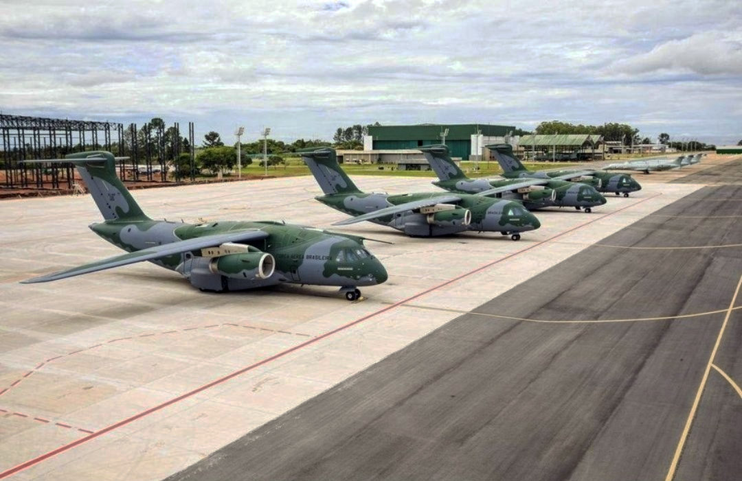As quatro primeiras unidades do KC-390 entregues à FAB alinhadas na Base Aárea de Anápolis – ALA-2 Foto FAB