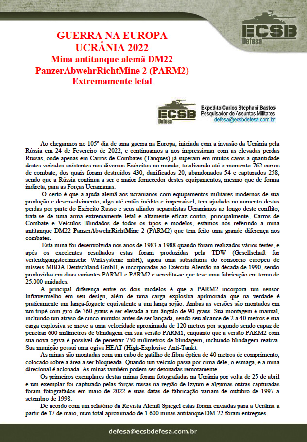 O certo é que a ajuda alemã aos ucranianos com equipamentos militares modernos de sua produção e desenvolvimento, algo até então inédito e impensável, tem ajudado no aumento destas perdas por parte do Exército Russo e seus aliados separatistas Ucranianos ao longo deste conflito, trata-se de uma arma extremamente letal e altamente eficaz contra, principalmente, Carros de Combate e Veículos Blindados de todos os tipos e modelos, estamos nos referindo a mina antitanque DM22 PanzerAbwehrRichtMine 2 (PARM2) que tem feito uma grande diferença nos combates.
