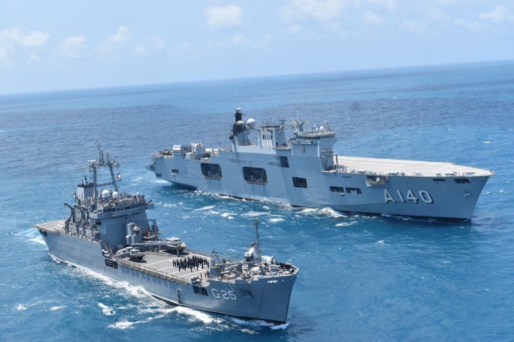 Na terça-feira (7), a Marinha do Brasil realizou exercícios de apoio logístico no Rio Amazonas, com o Navio-Aeródromo Multipropósito (NAM) Atlântico e o Navio de Desembarque de Carros de Combate (NDCC) Almirante Saboia. As manobras incluíram aproximação entre embarcações em formatura, sem passagem de cabos, e reabastecimento vertical entre navios por meio de helicópteros UH-12 Esquilo equipados com ganchos de carga.