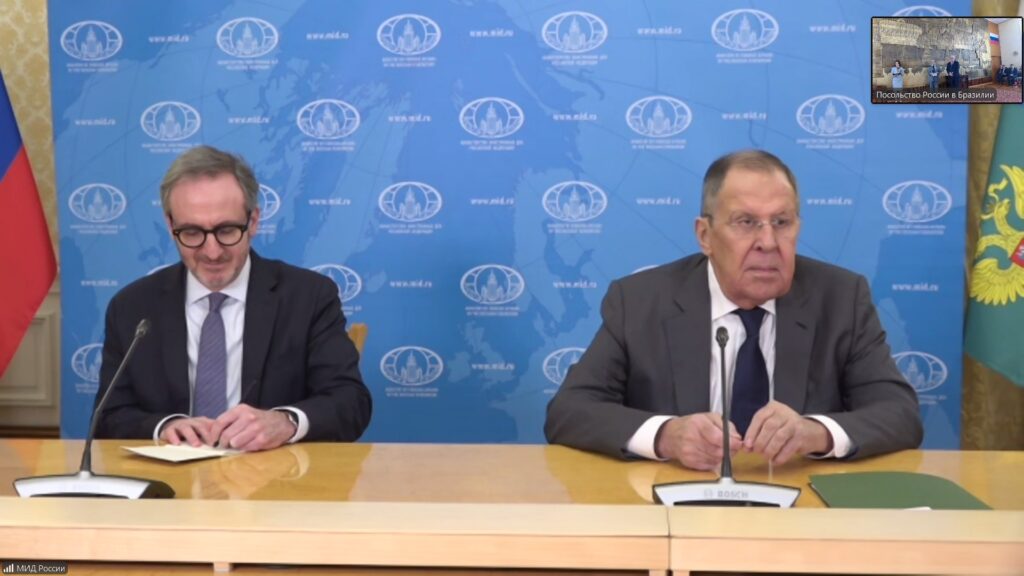 Imagem da videoconferência do Chanceler russo Sergey Lavrov na entrega da Ordem da Amizade Foto Embaixada da Rússia