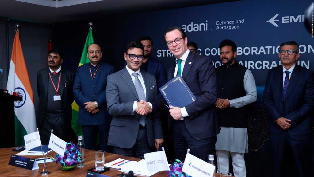 No campo civil, a Embraer deu um passo significativo ao assinar um memorando de entendimento com o conglomerado indiano Adani Group para estabelecer uma linha de montagem final de aeronaves regionais na Índia — uma iniciativa com implicações industriais e geopolíticas profundas.