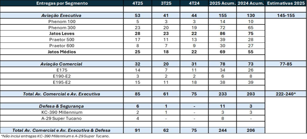 No ano de 2025, a empresa entregou um total de 244 aeronaves na Aviação Comercial, Aviação Executiva e Defesa & Segurança, acima das 206 unidades entregues no ano anterior.