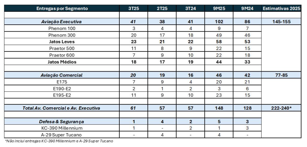 A Aviação Executiva realizou 41 entregas, versus 38 jatos entregues no 2T25 e 41 no 3T24. O destaque do trimestre ficou com o Phenom 300, o jato leve mais veloz em produção e líder de mercado por 13 anos consecutivos, com 20 unidades entregues.