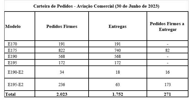 Obs.: Entregas e pedidos firmes em carteira incluem aeronaves vendidas para companhias aéreas estatais (Satena e TAME).