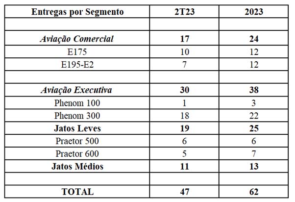 São José dos Campos – SP, 3 de agosto de 2023 – A Embraer entregou 47 jatos no segundo trimestre de 2023, sendo 17 comerciais e 30 executivos (19 jatos leves e 11 jatos médios). No ano, a empresa acumula um total de 62 aeronaves entregues (24 comerciais e 38 executivas). O volume total de entregas cresceu 47% na comparação com o segundo trimestre de 2022 e 35% na comparação com o primeiro semestre do ano passado, quando foram entregues 46 jatos. Na Aviação Comercial, a alta foi de 55% e na Aviação Executiva, de 43%. A carteira de pedidos firmes (backlog) encerrou o período em US$ 17,3 bilhões.